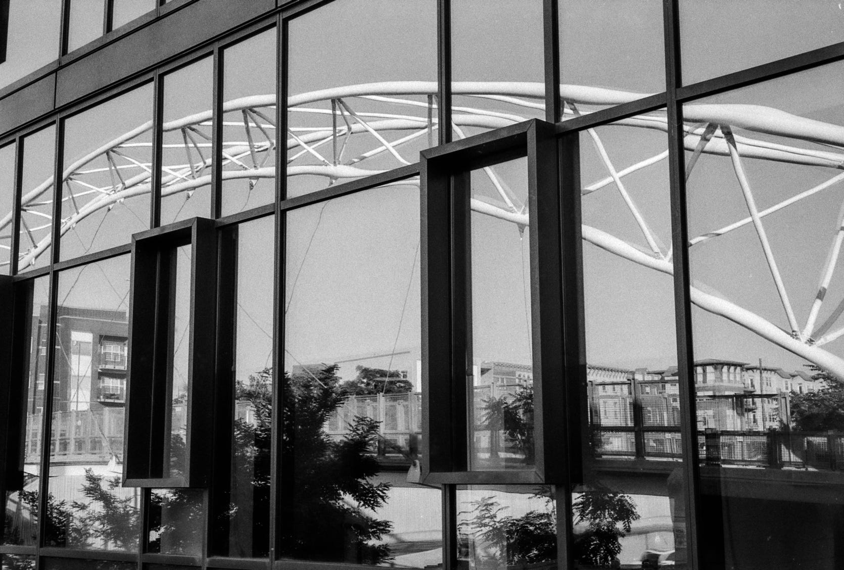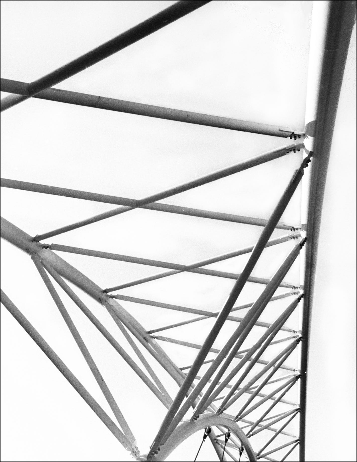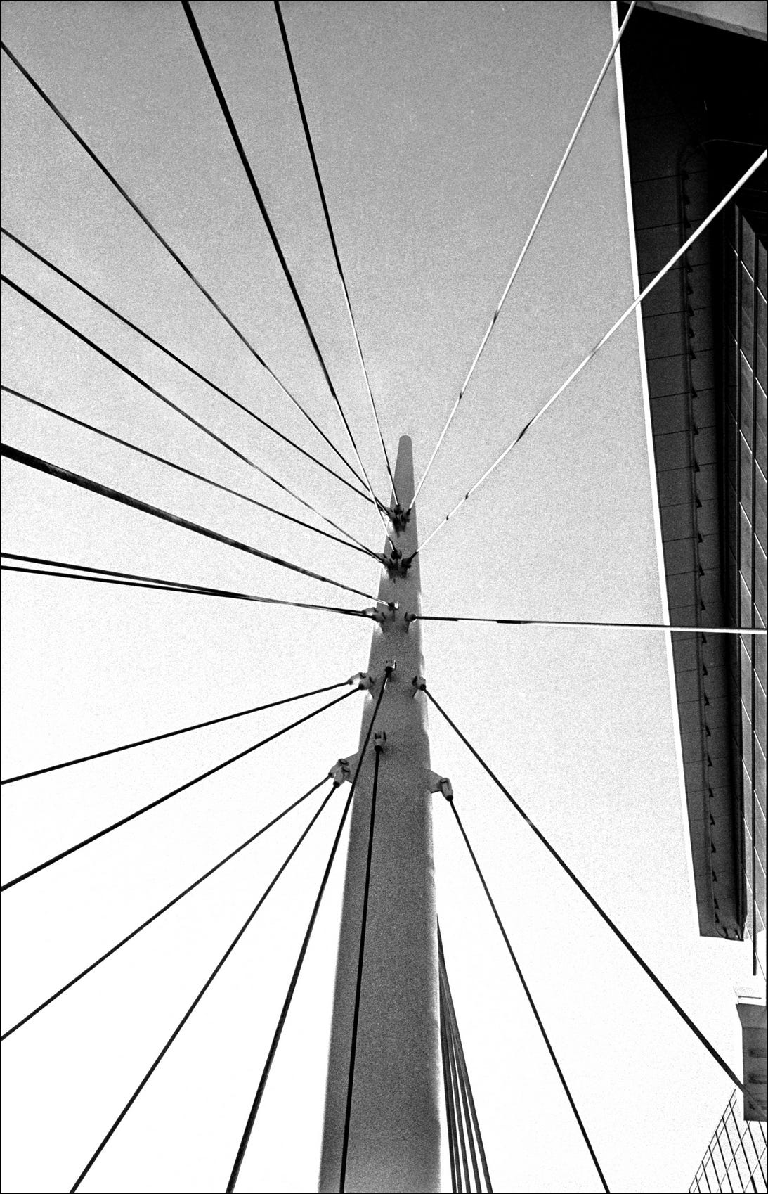 The Millennium Bridge in Denver. According to the Lonely Planet Guide, it’s the “world’s first cable-stayed bridge using a post-tensioned structural construction,” roughly meaning that the bridge is supported entirely by cables. Taken with my Leica M6 / Tri-X 400.